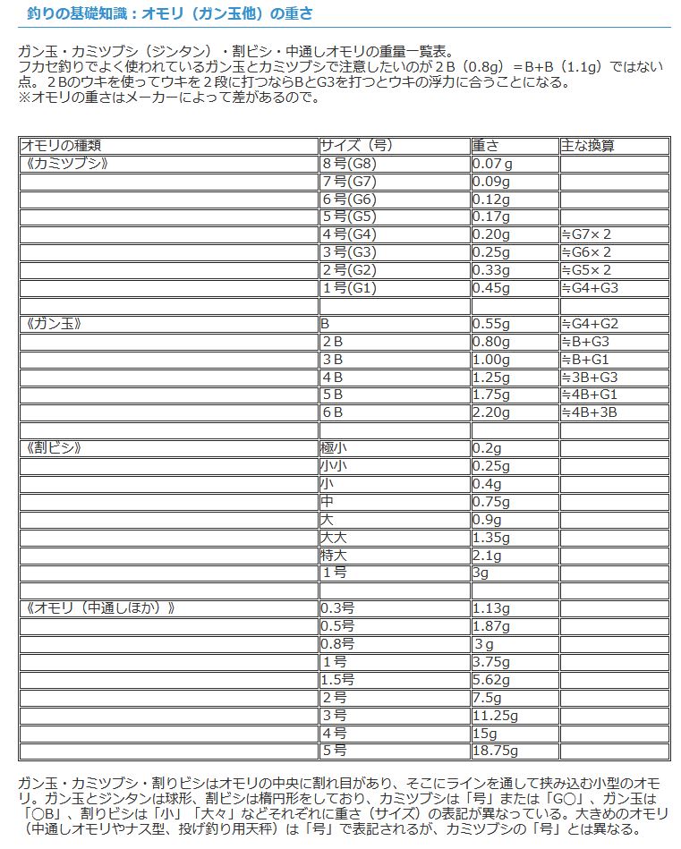 魚釣りをするときのオモリを買う時,店頭では浮きに合わせてこのくらいかなといい加減な選択で購入していたが,ネットで購入しようとすると,重さが分からない.そこで,またネットで調べていくと次のような表があった.(https://www.e-leisure.jp/basics/detail/21/ より)